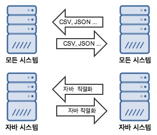 그러나, 자바의 온갖 컬렉션이나 참조형 타입들은 어떤가? 자바는 사용자에 따라 객체를 만들고 커스텀으로 타입을 만들 수 있기 때문에 단순 파일 포맷 만으로는 호환될 수 있는 타입에 한계가 있다. 이를 외부에 내보내기 위해선 각 데이터를 매칭시키는 별도의 파싱(parsing)이 필요하다.