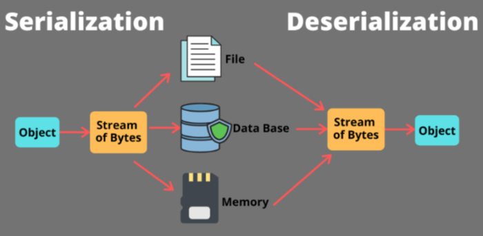 JVM(Java Virtual Machine)의 힙(heap) 또는 스택(stack) 메모리에 상주하고 있는 객체 데이터를 직렬화로 byte 형태로 변환 후 데이터베이스나 파일과 같은 외부 저장소에 저장해 둬 다른 컴퓨터가 해당 파일을 가져와 역직렬화를 통해 자바 객체로 변환하여 JVM(Java Virtual Machine) 메모리에 적재하는 것으로 이해하면 된다.