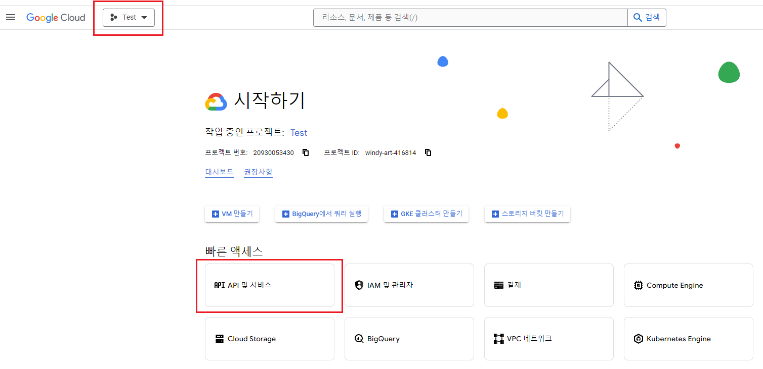 프로젝트 생성이 완료되었다면 만들어진 프로젝트를 선택하고, API 및 서비스로 이동합니다.