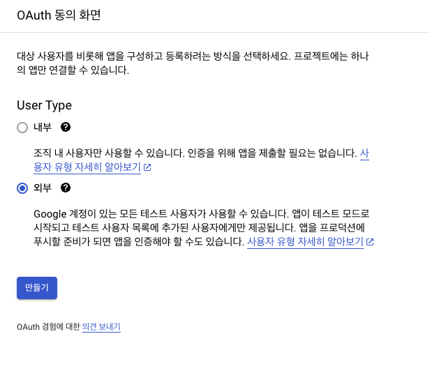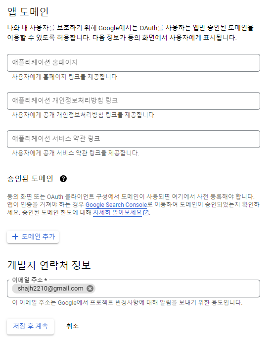 OAuth 동의 화면에 보일 앱 이름과 사용자 이메일, 개발자 연락처 정보 등등 원하시는 대로 설정하시면 됩니다.