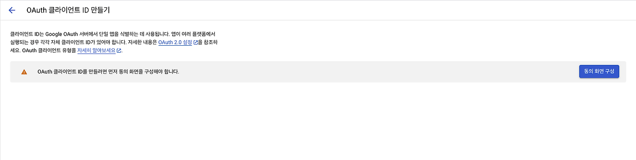 다시 대시보드로 돌아가 OAuth 클라이언트 ID 만들기를 누르고 필요한 정보를 적습니다.
