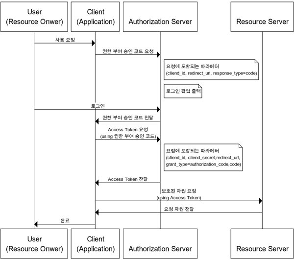 Authorization Server | 권한 서버입니다. 인증/인가를 수행하는 서버로 클라이언트의 접근 자격을 확인하고 Access Token을 발급하여 권한을 부여하는 역할을 수행합니다 |
