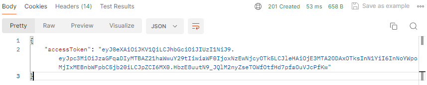 요청을 보내면 다음과 같이 Http 상태코드 201과 AccessToken이 응답되면 성공입니다.