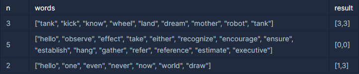 words는 끝말잇기에 사용한 단어들이 순서대로 들어있는 배열이며, 길이는 n 이상 100 이하입니다.