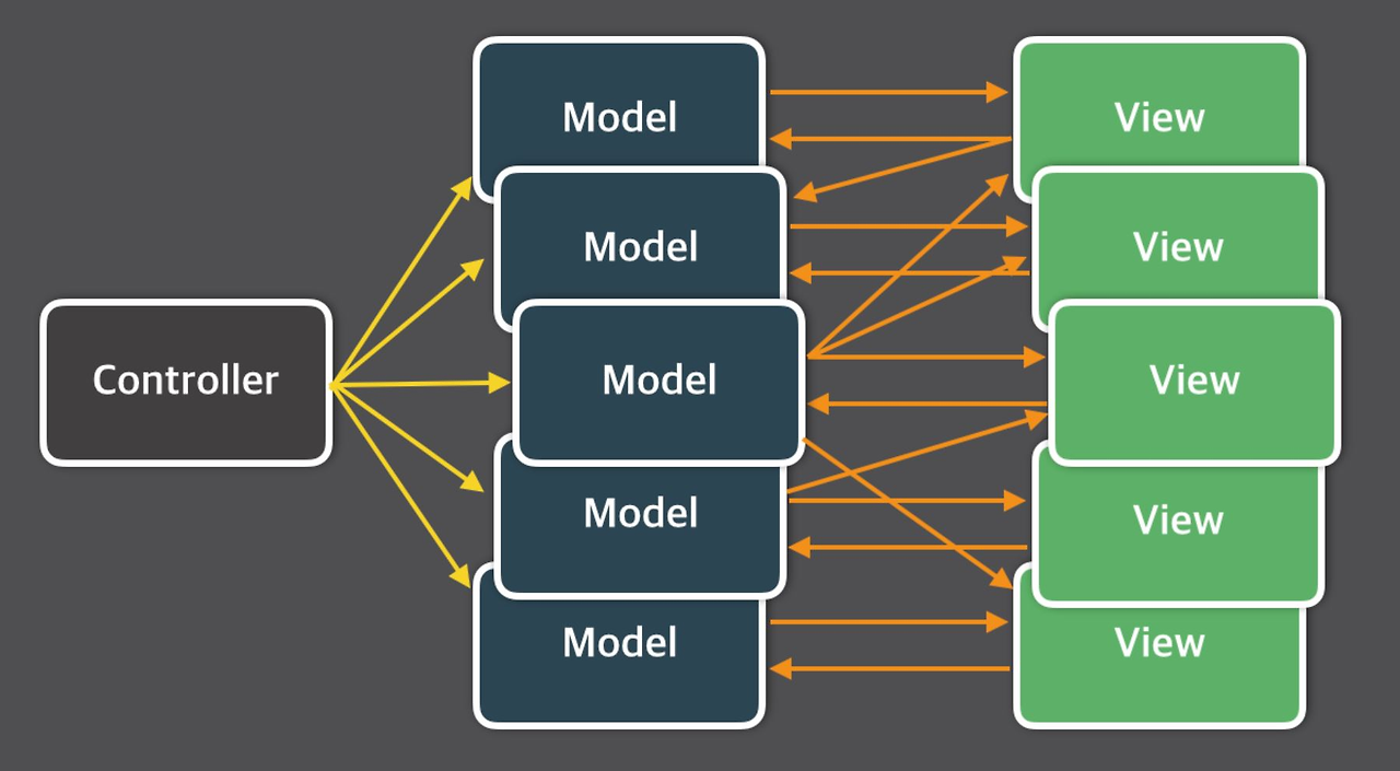 일반적으로 View는 Controller와 연결되어 화면을 구성하게 되는데, 이로 인해 Controller는 여러 개의 View를 다룰 수 있게 되며, Model은 Controller를 통해 여러 View와 연결될 수 있습니다. 이러한 상황에서 복잡한 애플리케이션일 경우 하나의 Controller가 다수의 View와 Model을 관리하면서 의존성이 커지는 경향이 있습니다.