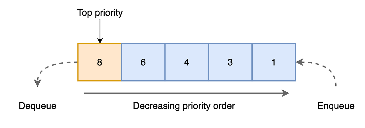 그러나 우선순위 큐(Priority Queue)는 삽입된 순서로 요소를 처리하는 것이 아니라, 우선순위에 따라 정렬되어 우선순위가 높은 요소가 먼저 처리됩니다.