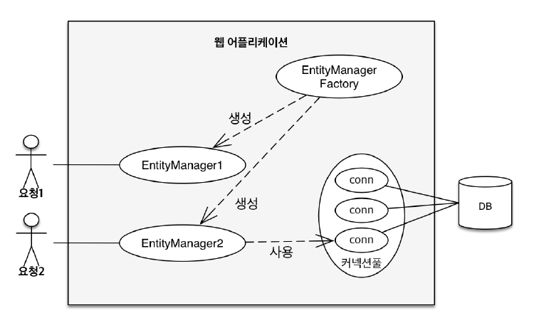 EntityManagerFactory는 애플리케이션의 시작 시점에서 DB 커넥션 풀을 생성하여 초기 생성 비용이 많이 드는 편입니다. 반면에 EntityManager의 생성 비용은 상대적으로 적어 필요할 때마다 EntityManagerFactory를 통해 EntityManager를 생성합니다.