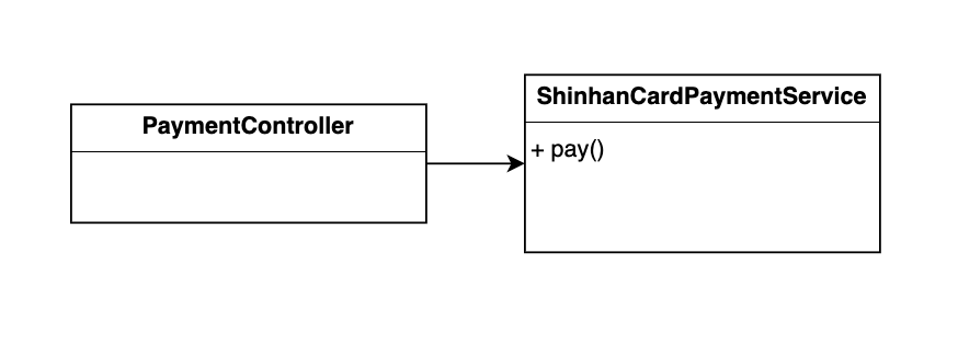 위 그림은 PaymentController(상위 모듈)가 ShinhanCardPaymentService(하위 모듈)를 의존하고 있습니다. 이를 코드로 보는 경우 다음과 같습니다.