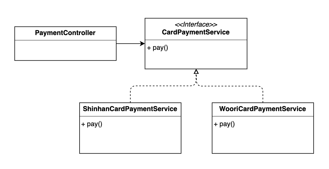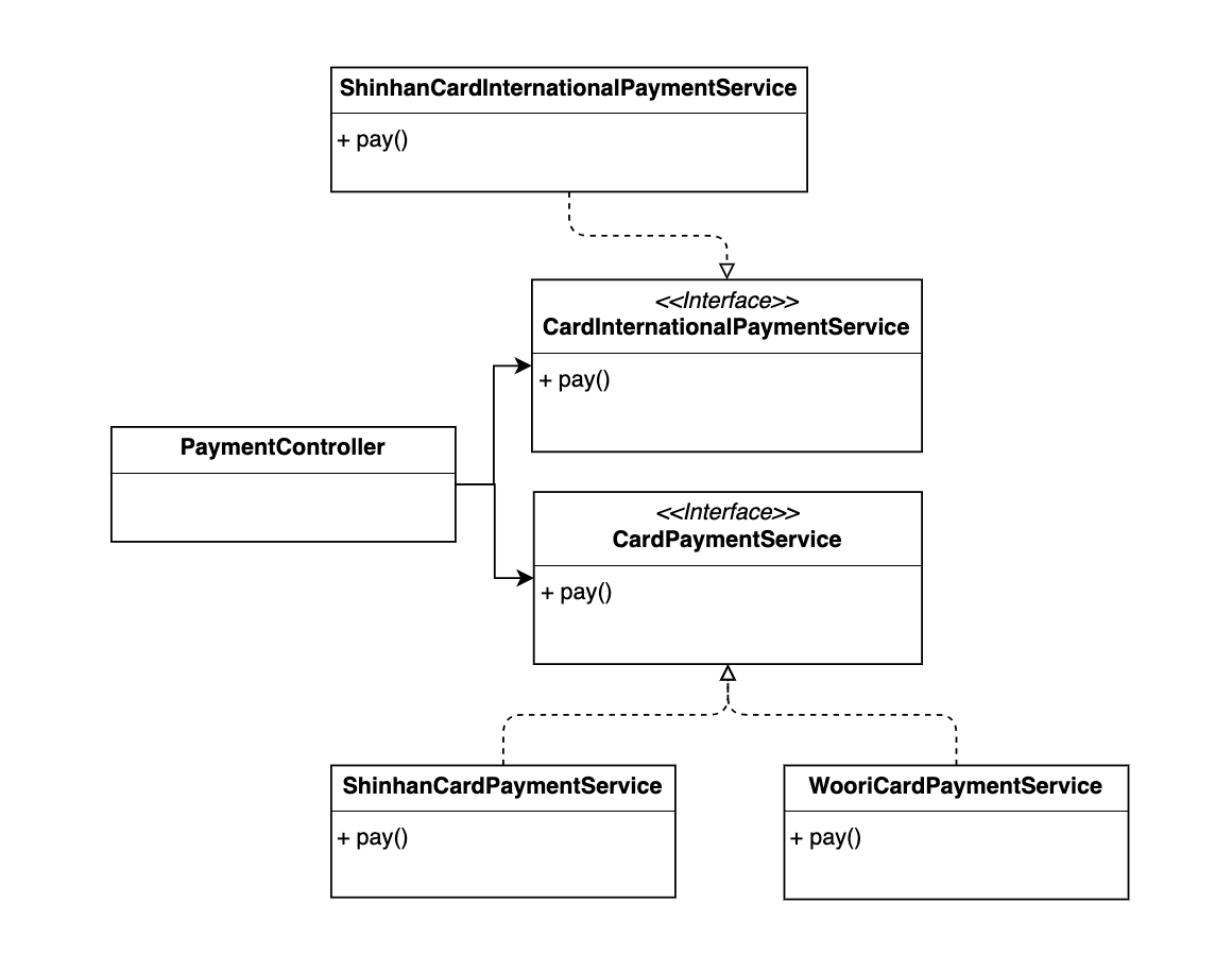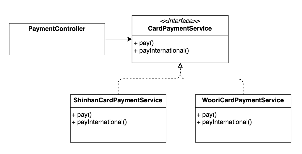위와 같이 신한카드는 해외 결제를 할 수 있으나, 우리카드는 해외 결제를 지원하지 않습니다. 각각의 구현 클래스들은 CardPaymentService 인터페이스를 구현하기 때문에 해외 결제 메서드 payInternational()이 추가되어야 합니다.