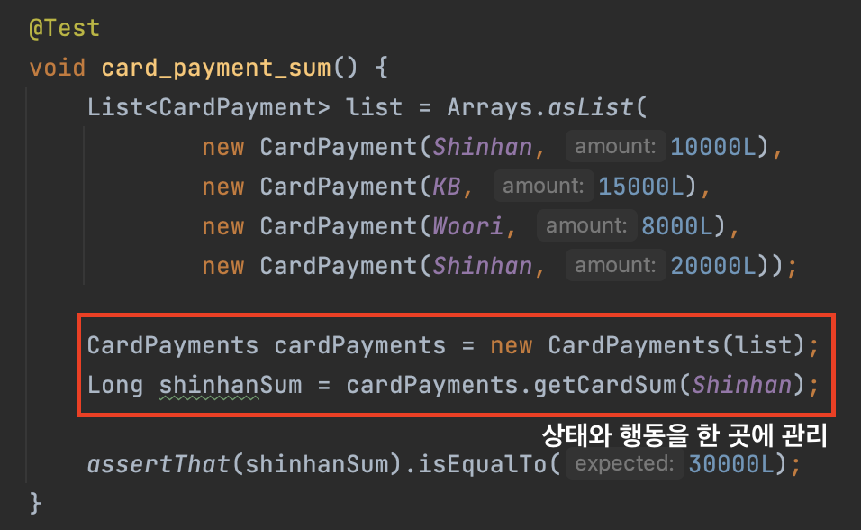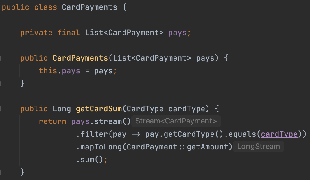 cardPayments 컬렉션과 계산 로직은 서로 관계가 있으나, 이를 코드로 표현할 수 없습니다.