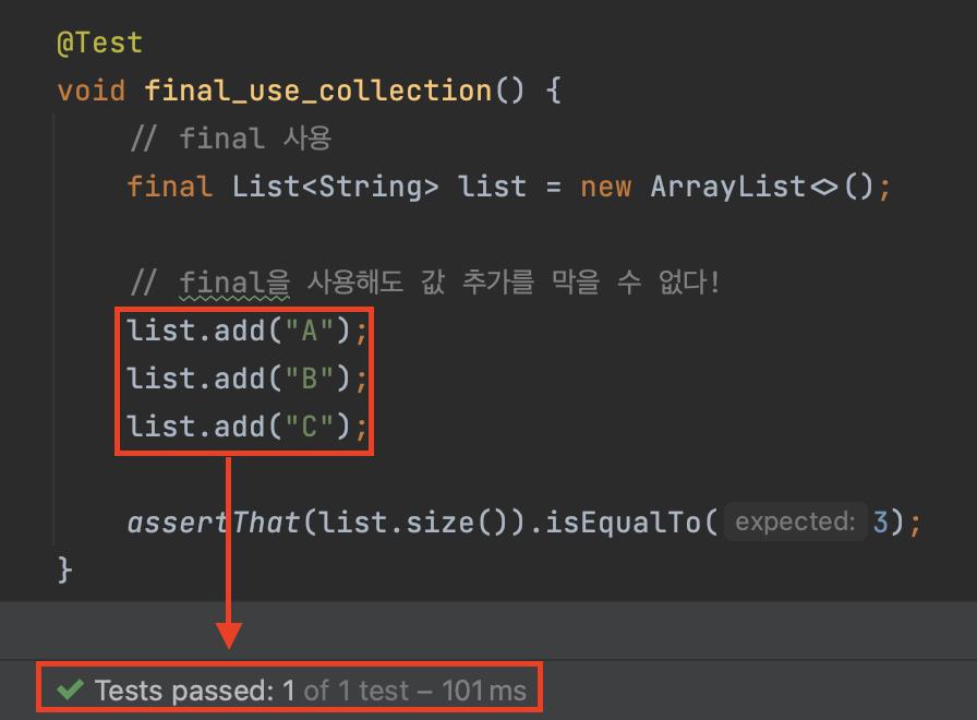 다음과 같이 final을 선언한 컬렉션은 값이 추가되는 것을 확인할 수 있습니다.