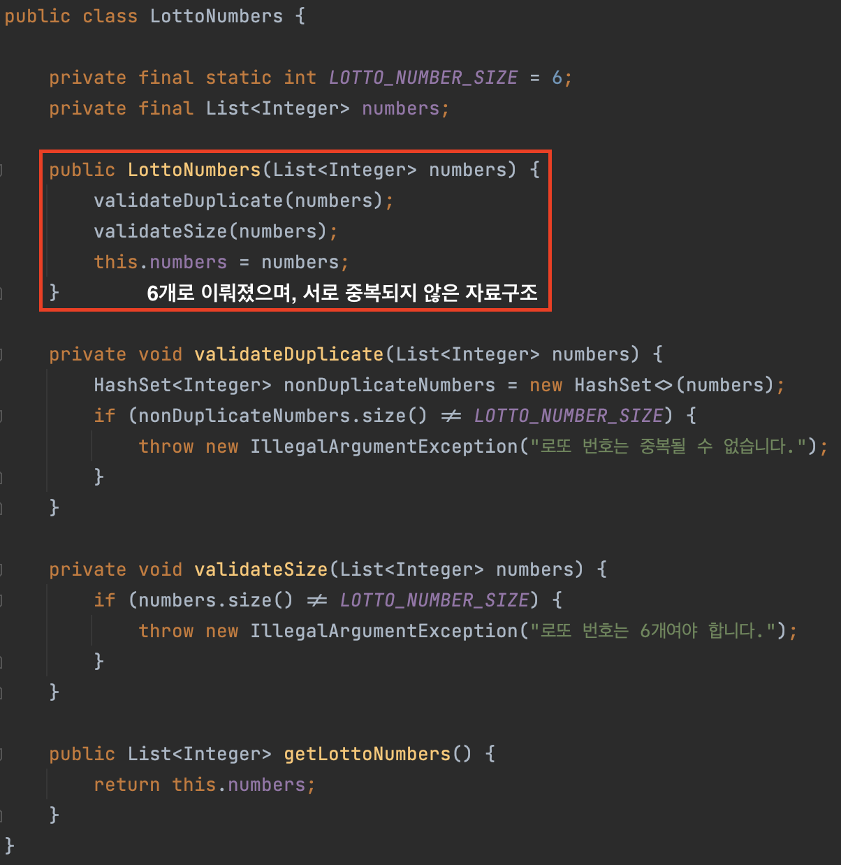이러한 방식은 로또 번호가 필요한 모든 장소에서 검증 로직이 들어가야만 합니다.