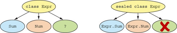 - `sealed class`를 상속하는 클래스를 정의하려면 반드시 부모 클래스 정의 안에 중첩(또는 내부) 클래스로 정의되어야 한다. (코틀린 1.1부터 같은 파일에만 있으면 되도록 개선되었다.)